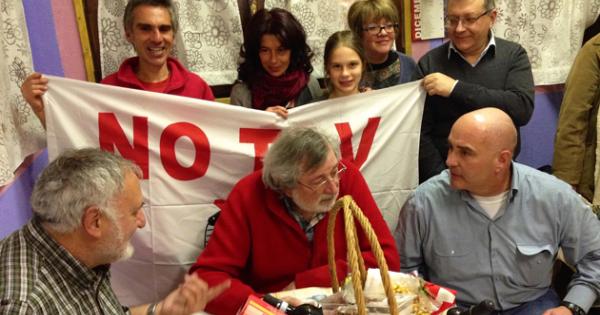 Francesco Guccini tiene a battesimo la prima uscita valsusina del Tpp, il Tribunale permanente dei popoli, anzi, l’uscita preliminare del Tpp, perchè la data vera è quella del 14 marzo 2015, quando a Torino si aprirà il processo per verificare se vi siano stati gravi violazioni di diritti fondamentali dei cittadini ed intere comunità locali in relazione alla realizzazione di grandi opere in Europa, a cominciare dalla valle di Susa per quanto riguarda la nuova linea ferroviaria Torino-Lione. La serata dell’altroieri al teatro Magnetto di Almese era organizzata dal Controsservatorio Valsusa, con il patrocinio del Comune di Almese, per raccogliere fondi a sostegno delle attività del Tpp. La giornata del Guccini No Tav, peraltro tema soltanto sfiorato sul palco quando ha dedicato la Locomotiva (senza cantarla) alla “vigorosa” lotta contro la Torino-Lione, era iniziata nel pomeriggio con la visita al presidio Picapera di Vaie, dove ha potuto ascoltare dalla viva voce degli attivisti, presenti anche sindaci, amministratori e tecnici, la ricostruzione sommaria di vent’anni di lotta.