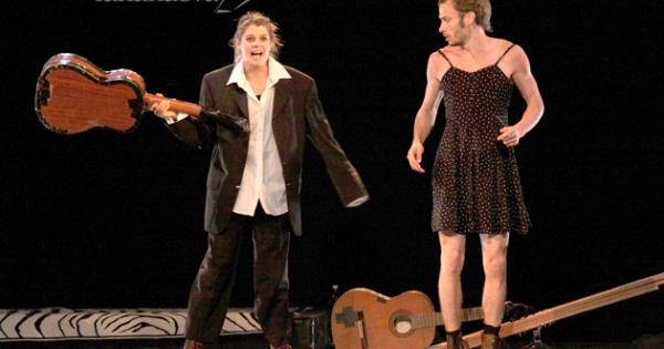 “Iou ar bicause” è l’opera prima dell’omonima compagnia, che racconta le burrascose dinamiche di una coppia di personaggi strampalati e divertenti. La scenografia si compone di alcune chitarre che diventano protagoniste della spiazzante pièce.